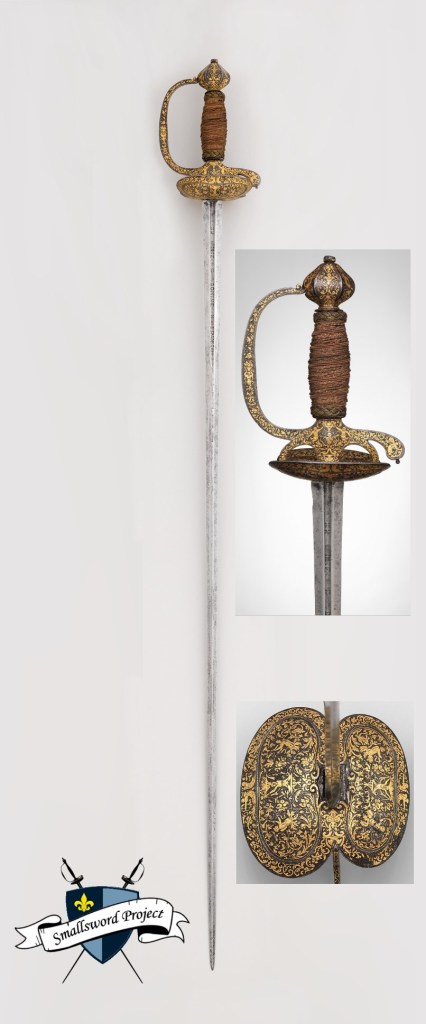 This early French smallsword (ca. 1655 C.E.) has few parallels. Its style reflects early French Classicism from the reign of Louis XIV, and was likely made in Paris. Its hilt features ornate foliage and figure motifs executed in gold inlay, and a faceted pommel. Its length measures 41″ (104.1 cm) overall with a blade length of 34 1/2″ (87.5 cm). The fullers on both sides of the blade are marked, “XX INTE X DOMINE X ESPADERO X” with an anchor-like cross at the forward end of the groove followed by three flat indents. Courtesy of the Metropolitan Museum, accession no. 2011.63.